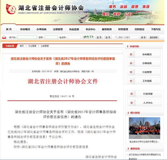 2017年5月27日湖北省注册会计师协会发布了《湖北省2017年会计师事务所综合评价前百家信息》的通告。湖北华审会计师事务所凭借良好的经营业绩、过硬的服务质量及企业口碑荣获“湖北省2017年会计师事务所综合评价第12名”。华审蝉联市州第一名。